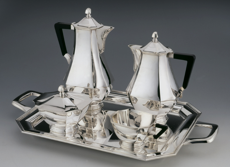 Juego de café Año 1992 Cafetera 26 cms. / Tetera 22 cms. / Jarra de leche 8,5 x 16 cms. de altura Azucarero 14 x 9,5 cms. / Bandeja con asas 50 x 40 cms. de ancho